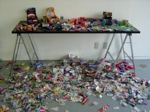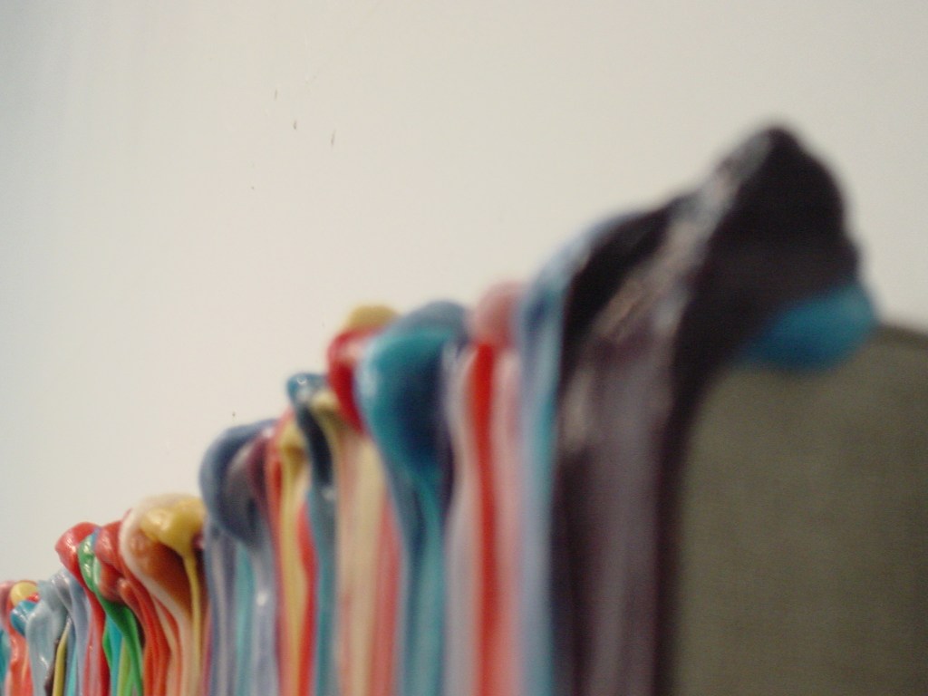 Bubblegum, chewed/mixed in the artist’s mouth, stretched across canvas. Seduction and repulsion. Pigment on support. Paintings.